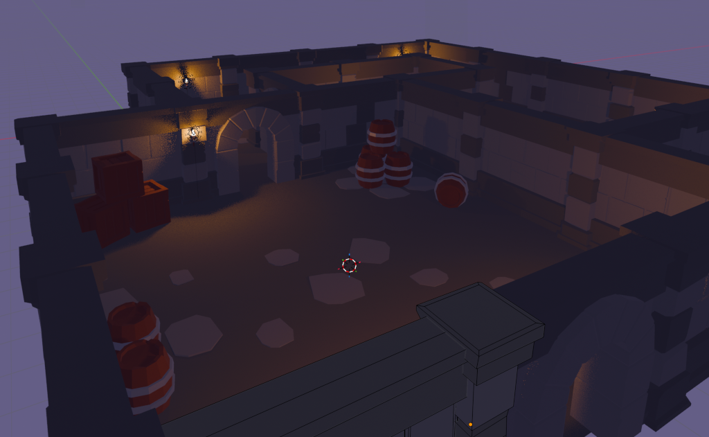 By my third attempt, I was finally confident enough to create something coherent, and I enjoyed the process. I made some assets, including a few walls, columns, a gate, a barrel, a crate, a torch, and tiles for the floor. Then I combined them to assemble what looks like a dungeon for a board game. I suppose I may even reuse those assets to create something in Unity.